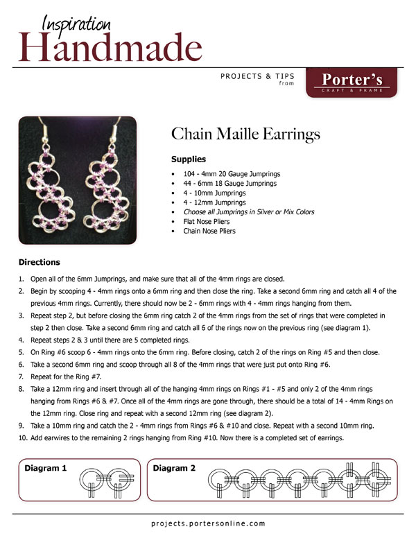 Chain Maille Earrings Create these beautiful and fun Chain Maille Earrings out of beading jump rings. Fun and exciting to make. Choose all silver rings, or mix and match to create a distinct look. Click to download FREE project sheet. Click here to download FREE project sheet. Share this: Email a link to a friend (Opens in new window) Email Print (Opens in new window) Print Share on Facebook (Opens in new window) Facebook Share on X (Opens in new window) X Share on LinkedIn (Opens in new window) LinkedIn Like Loading... Leave a comment Cancel reply Δ