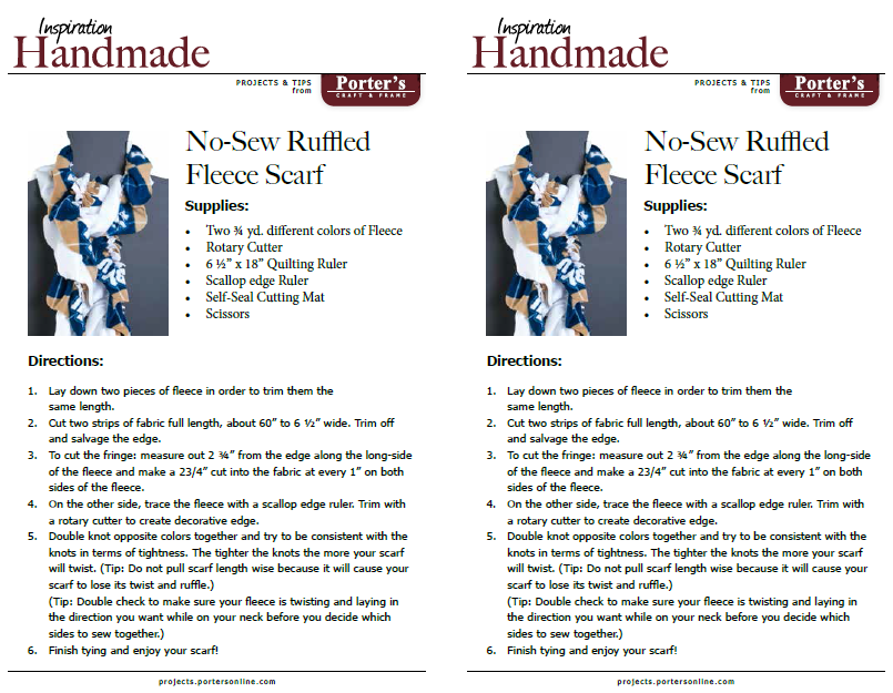 No-Sew Ruffled Fleece Scarf Ruffle Scarf A no-sew ruffle scarf made of fleece! Click here for the FREE Project Sheet. Share this: Email a link to a friend (Opens in new window) Email Print (Opens in new window) Print Share on Facebook (Opens in new window) Facebook Share on X (Opens in new window) X Share on LinkedIn (Opens in new window) LinkedIn Like Loading... Leave a comment Cancel reply Δ